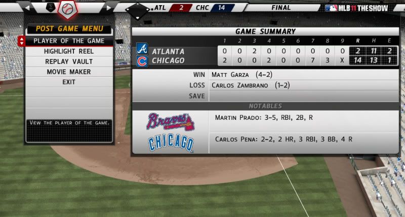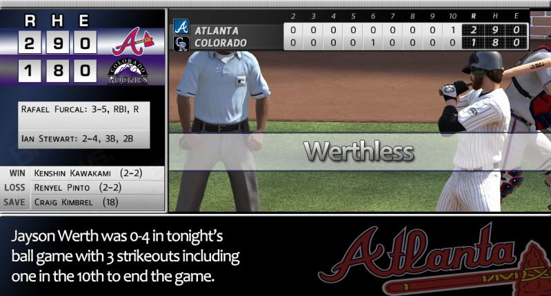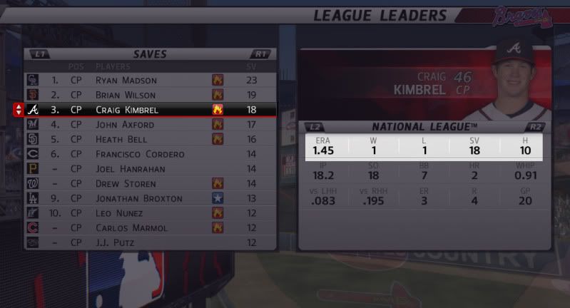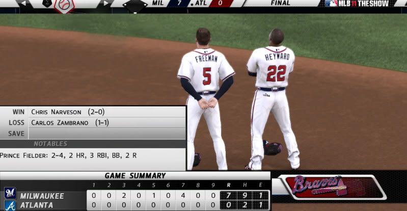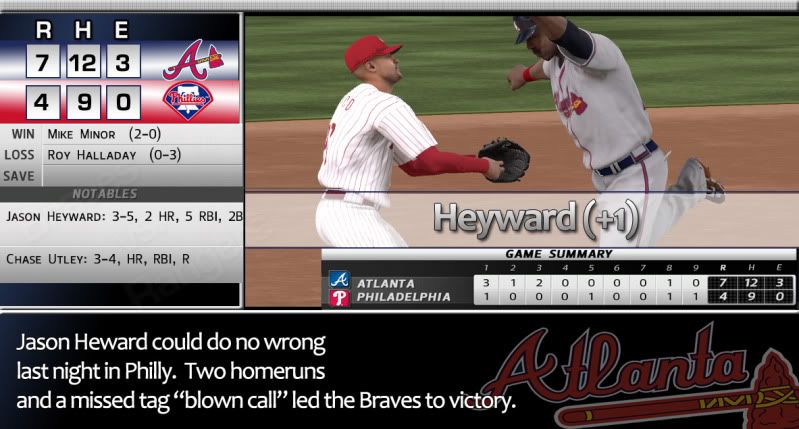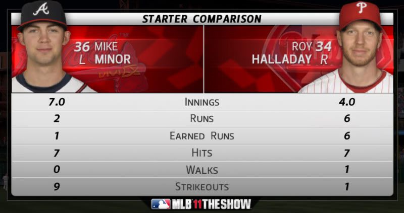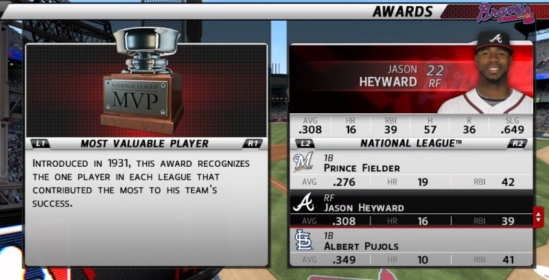 Remember last season how much we were on Albert Pujols's jock? The only Non Braves CPU player to ever get his own highlight? Well Votto is damn near the same player with a different mother. We simply could not pitch to this guy because any pitcher's pitch was getting squeezed at the plate, and any hitter pitch was getting jacked over the wall.
