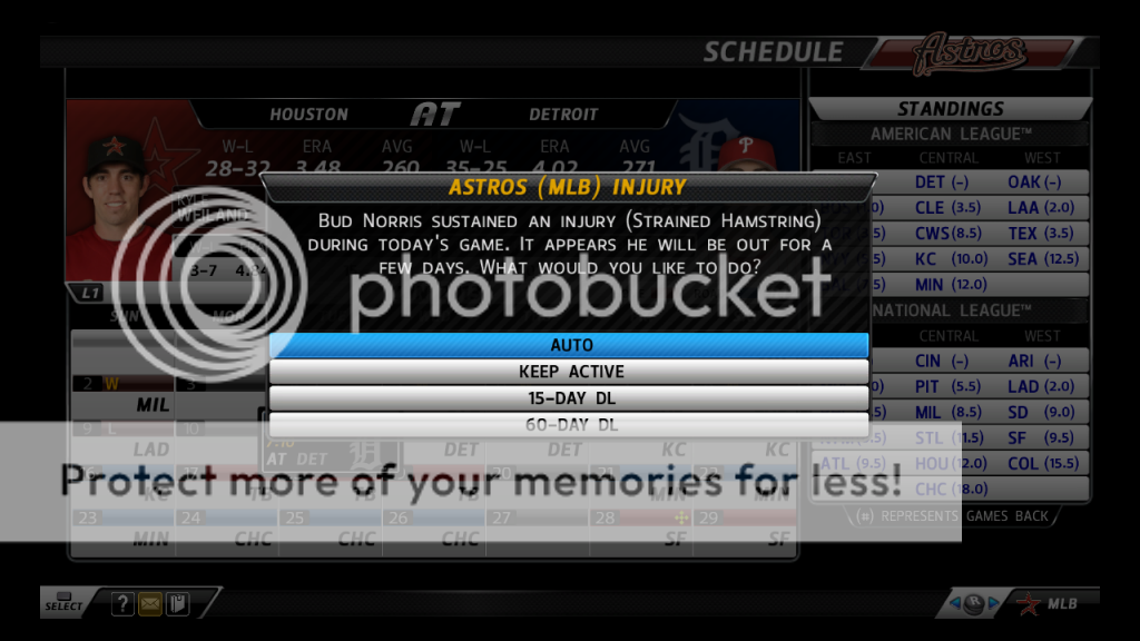 Now THOSE are some numbers. JV's are nice, Bud's are ridiculous...JA Happ errr I mean, Sergei Nikolav esque. Damned Russian spy screwing up my awesome reference. Regardless of my references, Bud pitched well in the first and second innings and ran into a brick wall in the 3rd. And by that, I mean he ran into an injury which forced him to be removed from the game! Which was not good for us, we had to turn to Wilton Lopez of all people to handle the rest of the game. Thankfully we'd get 1 more of JV and knock him out after the 6th inning. And the pen was spectacular for us! Check out the midgame update with us leading 3-1