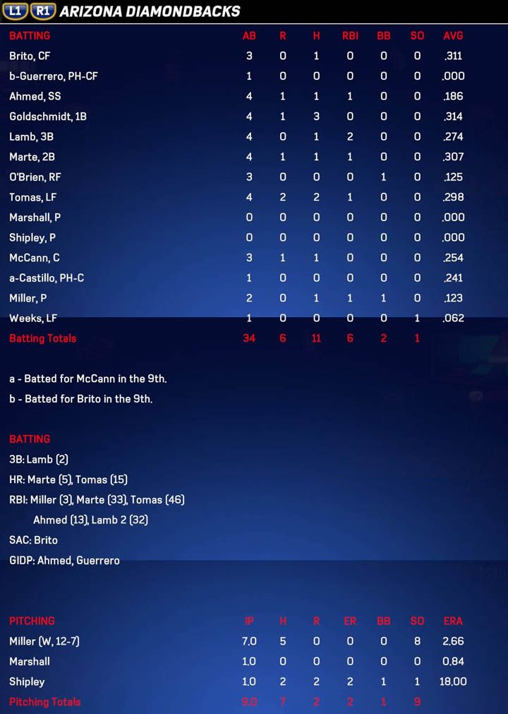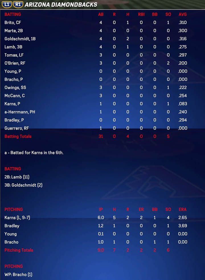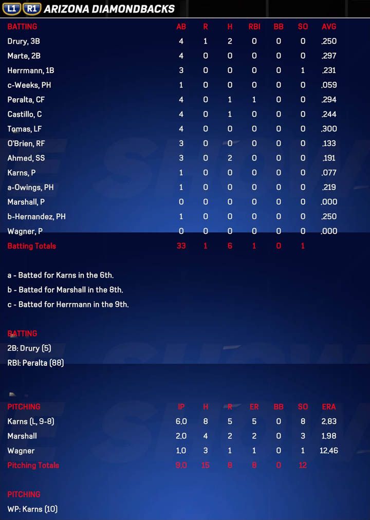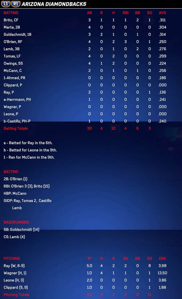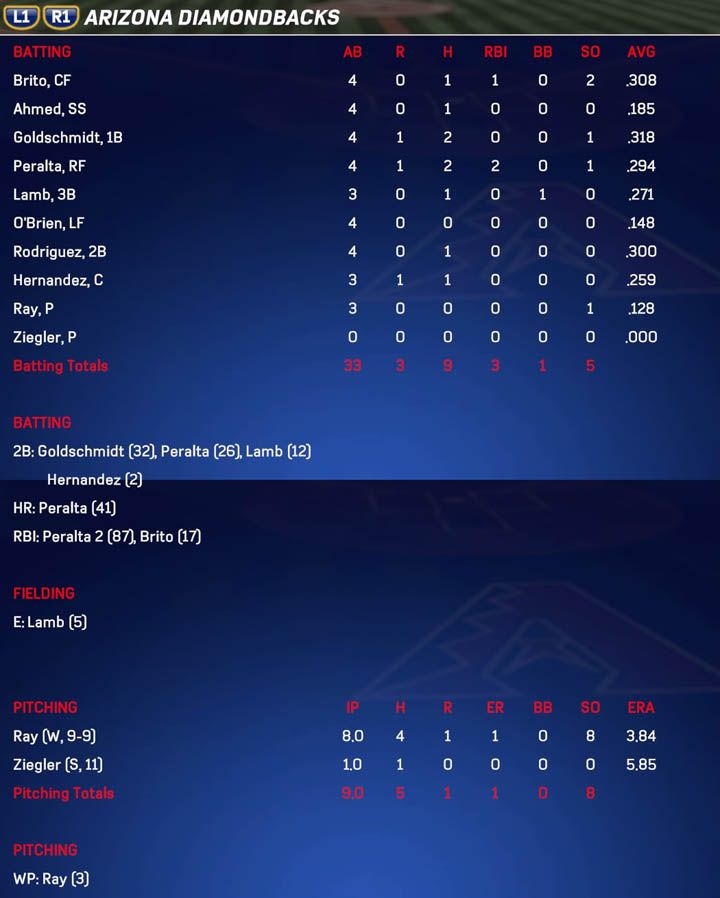 Notes: OF David Peralta, the team leader with 40 home runs, injured his back during batting practice and was unable to go in the game. He is listed as day-to-day with back stiffness, and was replaced in RF by Peter O'Brien. The club does not think that the injury is serious and he should miss only a few days.