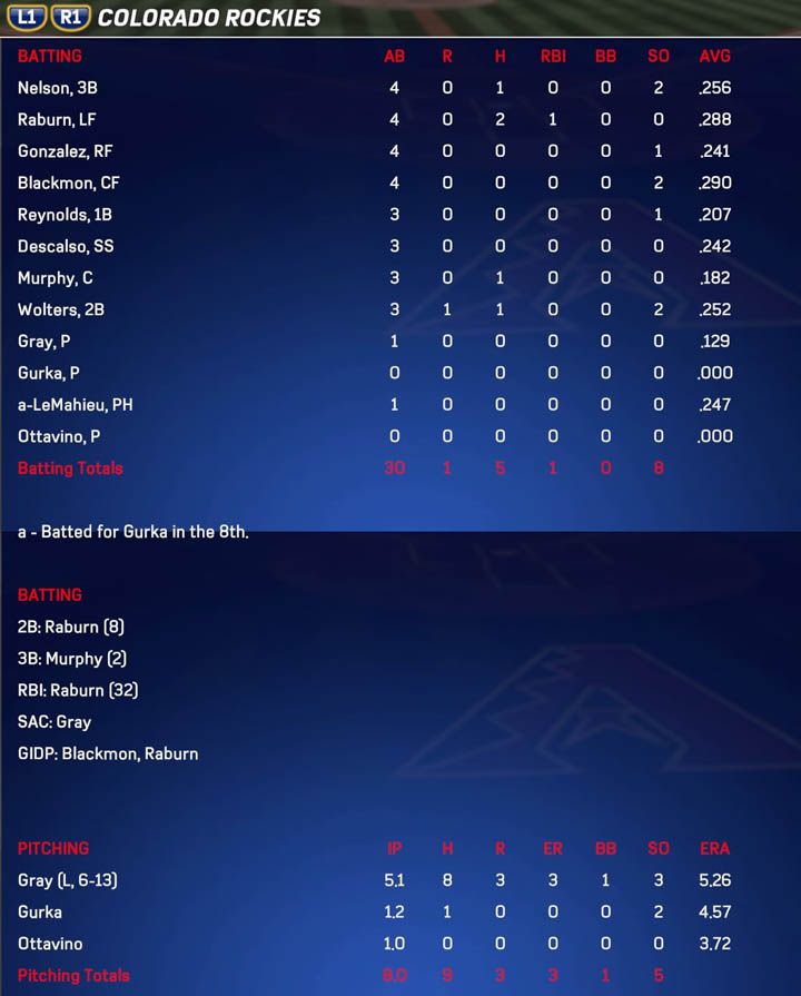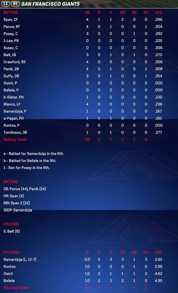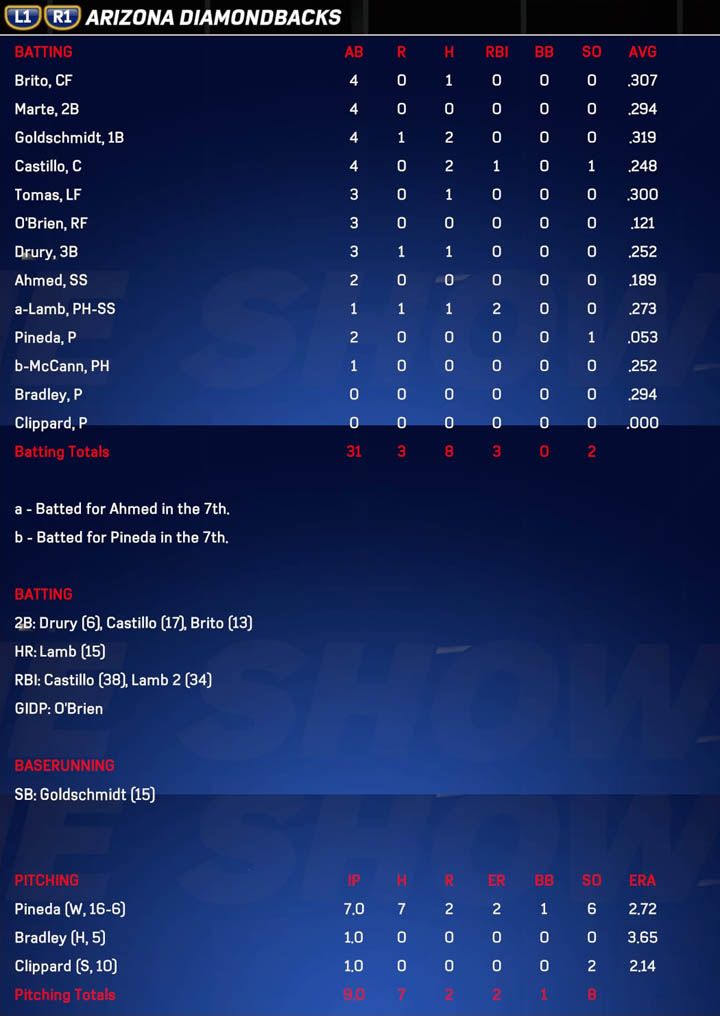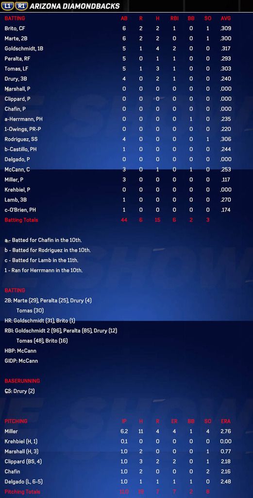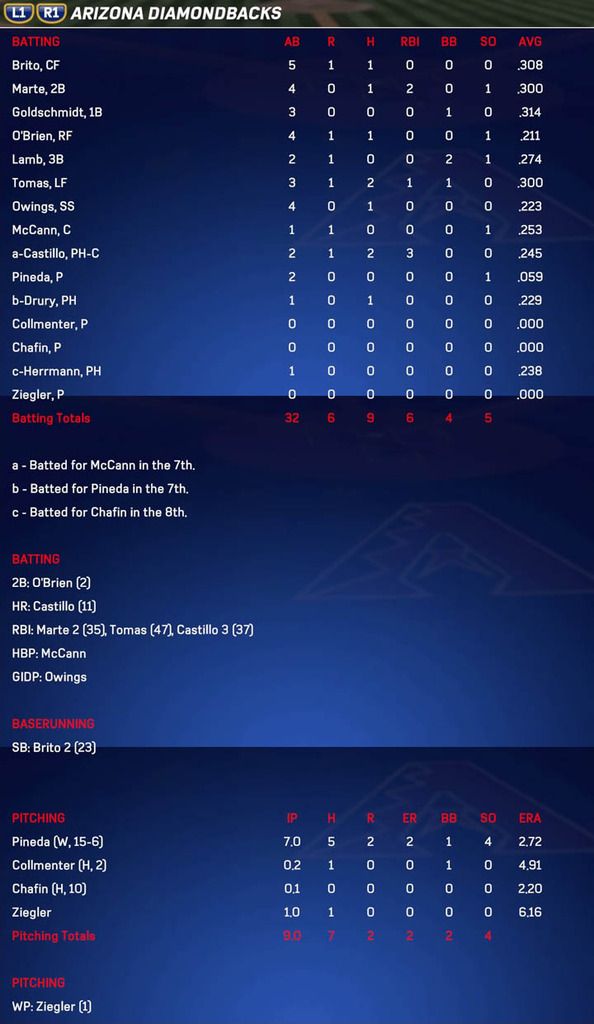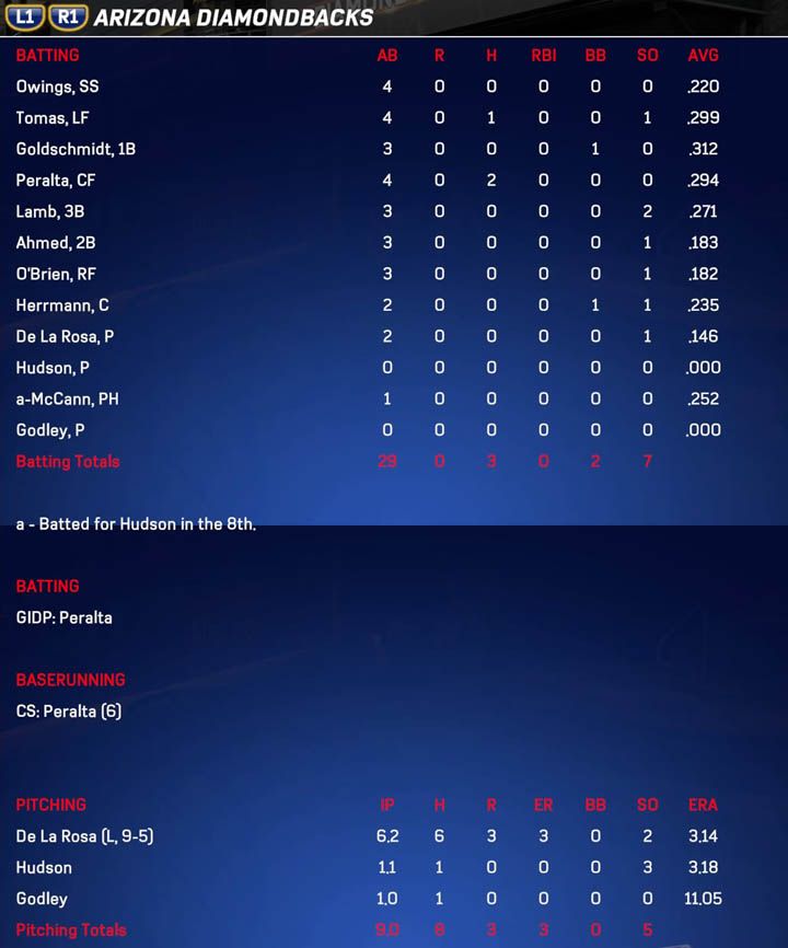 Notes: OF David Peralta, the team leader with 40 home runs, injured his back during batting practice and was unable to go in the game. He is listed as day-to-day with back stiffness, and was replaced in RF by Peter O'Brien. The club does not think that the injury is serious and he should miss only a few days.