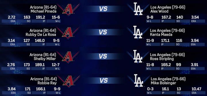 The series concludes on Wednesday evening as the DBacks will go for the sweep. It will be Robbie Ray (7-9, 3.99) going up against a Dodgers starter TBD.