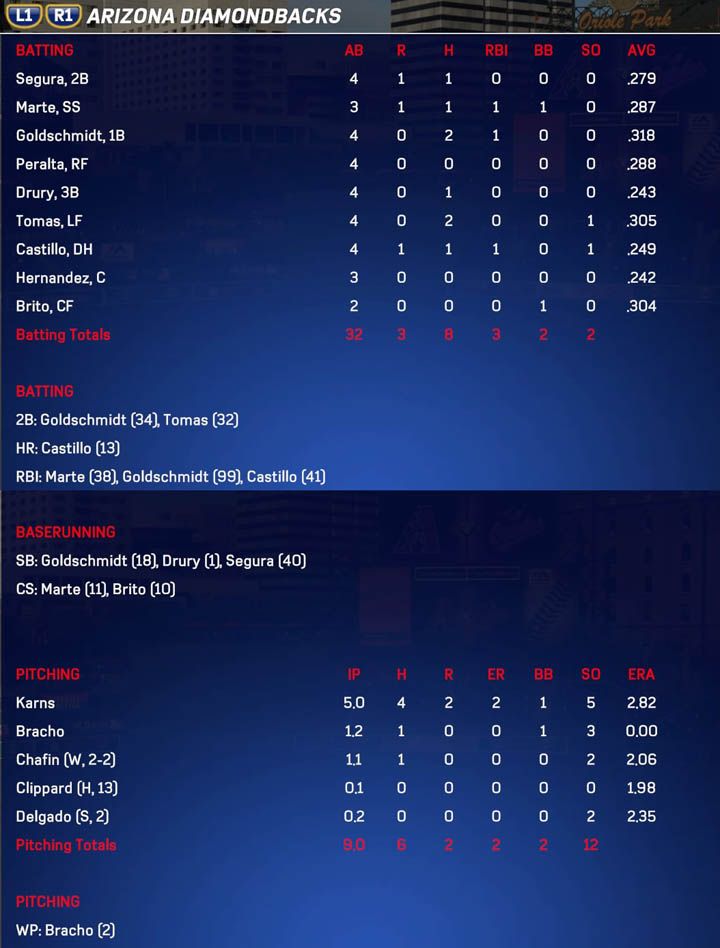 Nate Karns would only last five innings as he drove his pitch count to almost 100 pitches through five. He allowed the two earned runs on just four hits. He struck out five and walked one, but did not figure into the decision. Silvino Bracho, Andrew Chafin, Tyler Clippard and Randall Delgado worked the final four innings of shutout relie. Chafin picked up the win, with Delgado picking up his second save. He had to come on for Clippard, who left the game with a groin injury after facing just one batter in the ninth.