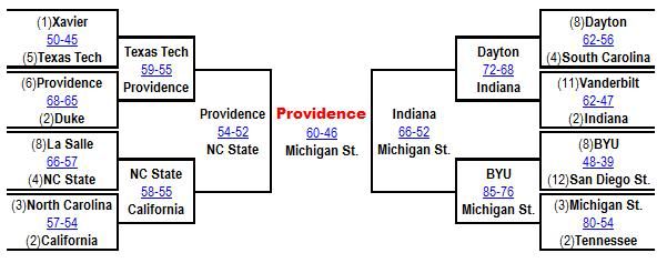 Michigan State and Providence for the title game. The Spartans were the heavy favorite, but the Friars weren't having any of that. Providence dominated the turnover battle and shot much better than the Spartans and shocked the basketball world with a 60-46 win and won the 2013 NCAA national title!