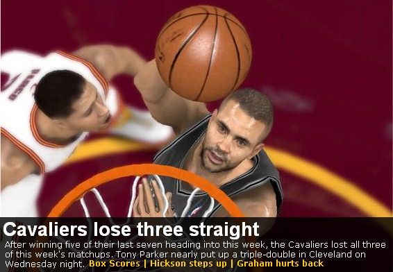 Unfortunately, it wasn't all good news for the Cavs as backup point guard Daniel Gibson left the game in the second quarter with a back injury. The training staff diagnosed it as a lower back strain and preliminary reports have him slated to miss 1-2 weeks of action. Next week, the Cavaliers continue their home-stand against Philadelphia and San Antonio before traveling to New York to take on the Knicks yet again on Friday.