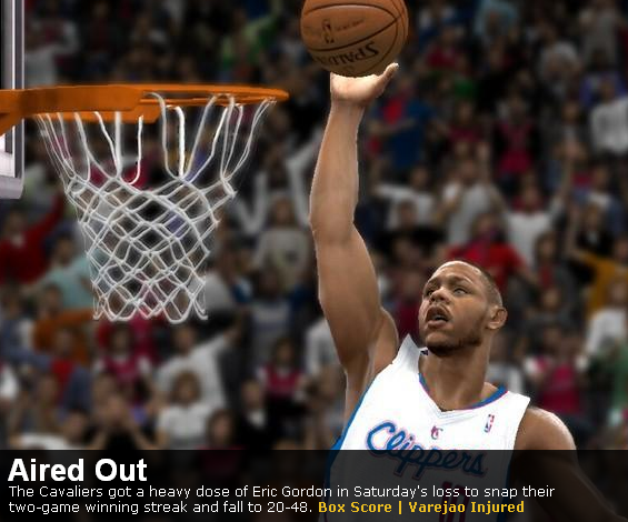 With a two game winning streak going, the Cavaliers headed to Los Angeles to take on Eric Gordon and the Clippers. Gordon put up 39 points to lead the Clippers to an 8-point victory. Anthony Parker had his best game of the season, dropping 25 points including 5 shots from beyond the arc. Rookie Kenny Adams also had his best performance, nearly amassing a double-double in his 16 minutes on the floor. Unfortunately, not only did Cleveland lose the game, but Anderson Varejao and Daniel Gibson each suffered injuries. Luckily they don't appear to be too serious but Varejao will likely miss at least a week while Gibson is day-to-day.