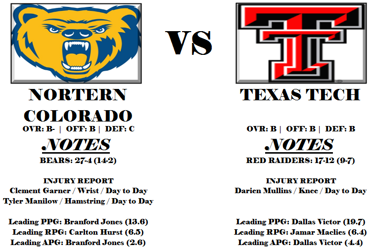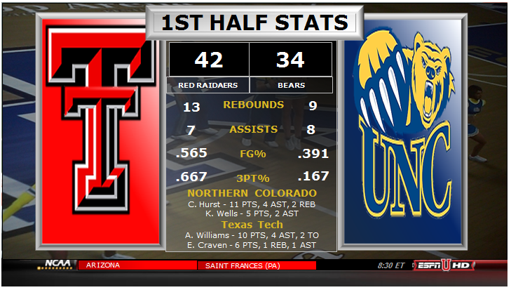 Ray Hand: Northern Colorado turned some heads this season and emerged as one of the best Mid-Majors around, in fact -- they were good enough to earn a #6 seed in this here Big Dance. We're now at halftime and the Bears are getting knocked around by the lower seeded Texas Tech. What are your thoughts on it David?