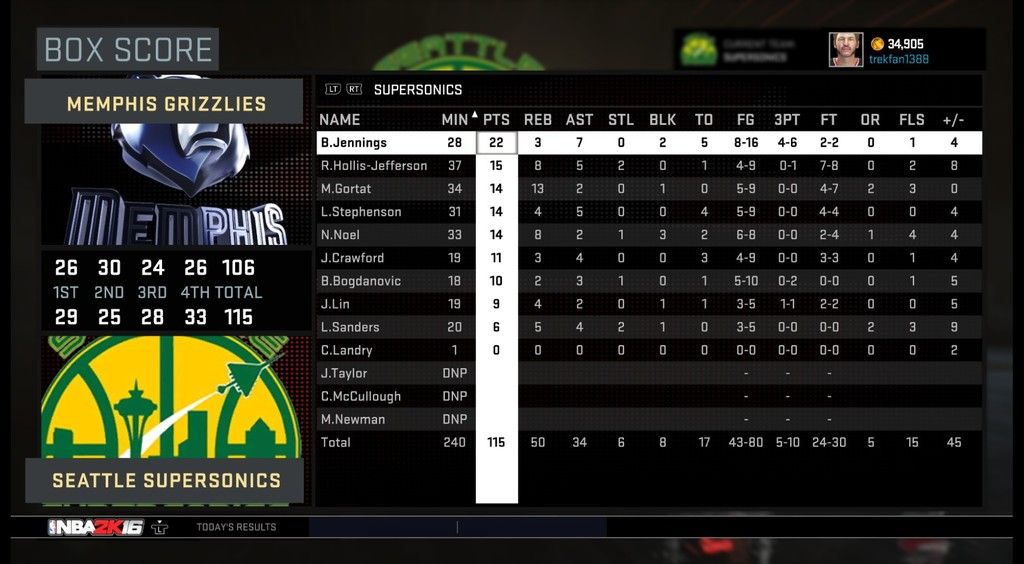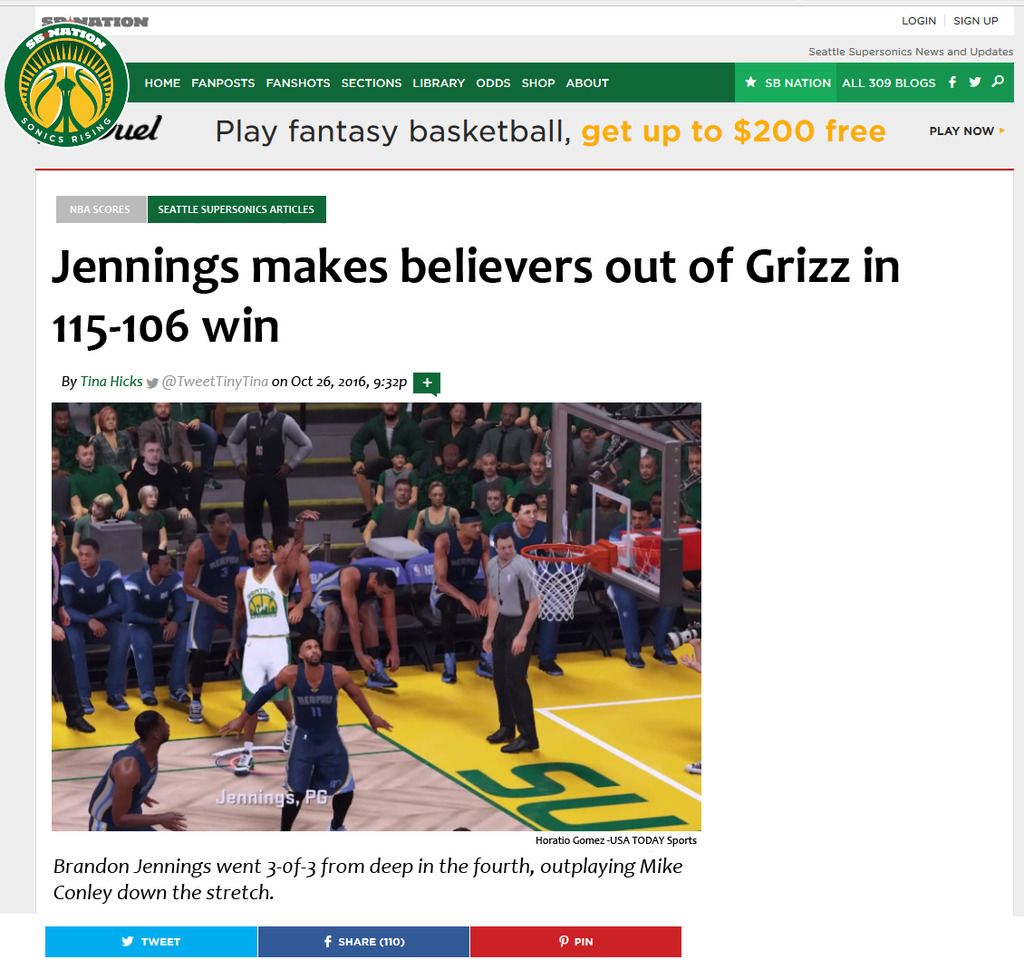 The Grizzlies could not stop him. Jennings dished, drove, and shot lights out from the floor, finishing the game with 22 points, seven dimes, three boards, two blocks (and five turnovers, but we'll overlook that) on 8-of-16 shooting, 4-of-6 from deep. The Grizzlies had no answers as Seattle's offense took on a form that few saw last season.