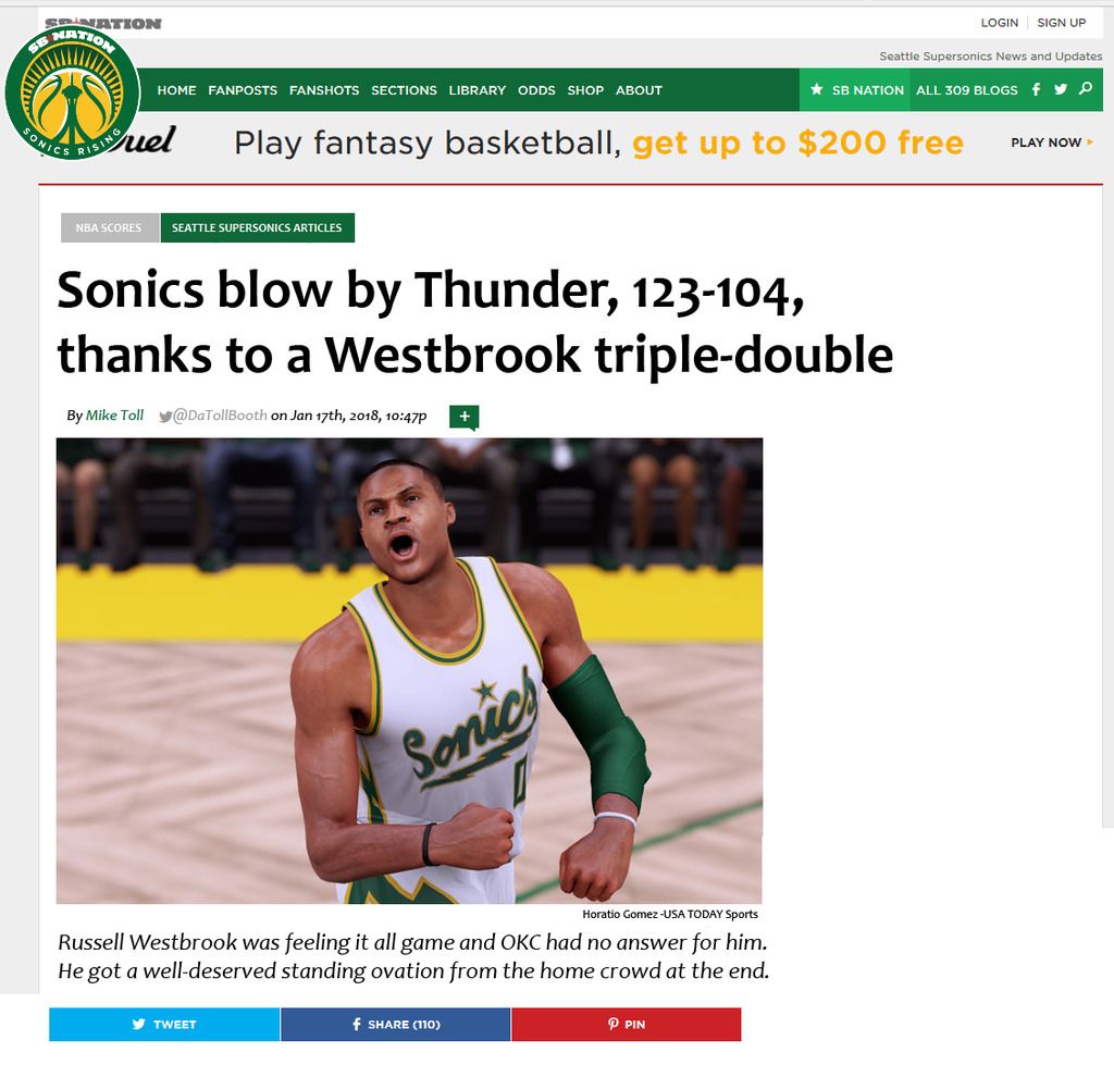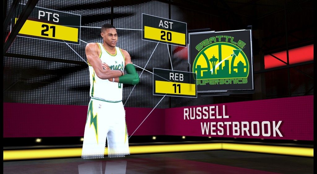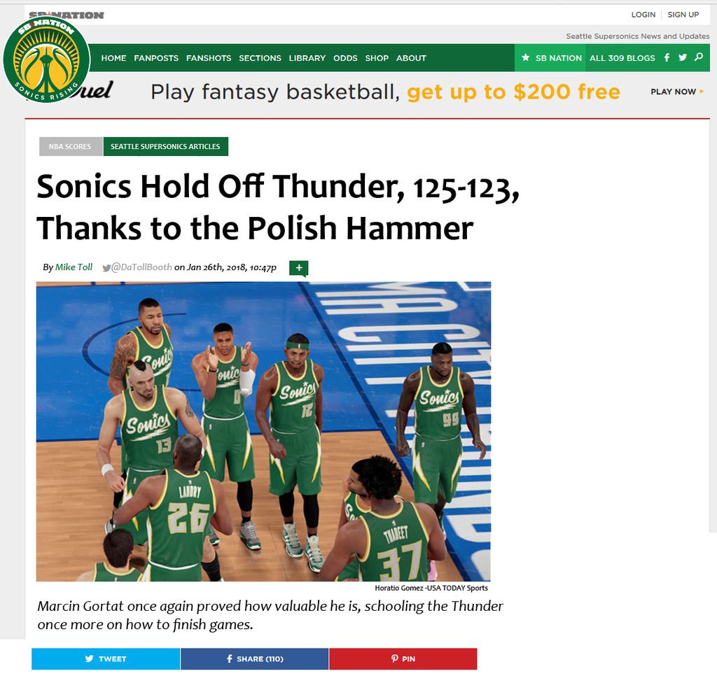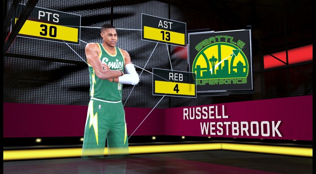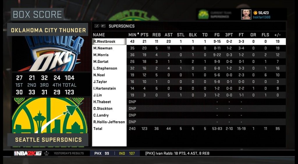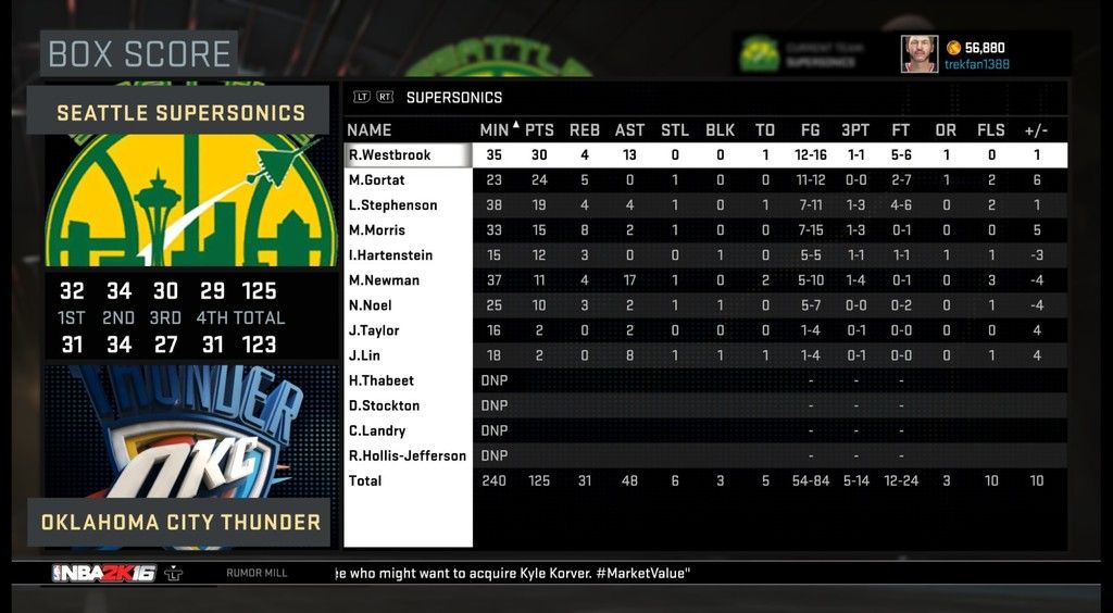 The Thunder went down big and Durant was subbed out. Seattle took a 63-48 lead into the half. Westbrook was on fire and feeling it, so the Sonics kept feeding him. Despite Noel being in foul trouble all night long (eventually fouling out halfway through the fourth), the Sonics continued to run flawlessly. Malik Newman was a monster shooting the ball, Gortat was schooling fools in the post again, and J-Lin was passing the ball like he does.