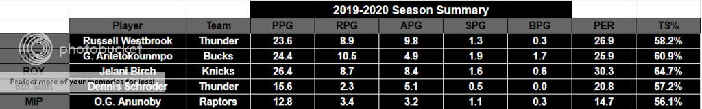 2019-2020 Award Winners Award Player Pos Team Most Valuable Player Russell Westbrook G Thunder Rookie of the Year Jelani Birch G Knicks Sixth Man of the Year Dennis Schroder G Thunder Defensive Player of the Year Giannis Antetokounmpo F Bucks Most Improved Player O.G. Anunoby F Raptors Coach of the Year Brett Brown Coach 76ers All-NBA 1st Team All-NBA 1st Team Russell Westbrook G Thunder Jelani Birch G Knicks Giannis Antetokounmpo F Bucks LeBron James F Lakers Karl-Anthony Towns C Timberwolves All-NBA 2nd Team All-NBA 2nd Team Stephen Curry G Warriors John Wall G Wizards Kawhi Leonard F Raptors Kevin Durant F 76ers Joel Embiid C 76ers All-NBA 3rd Team All-NBA 3rd Team Kyrie Irving G Pacers Chris Paul G Rockets Paul George F Thunder Kristaps Porzingis F Knicks Andre Drummond C Pistons All-Defensive 1st Team All-Defensive 1st Team Chris Paul G Rockets John Wall G Wizards Giannis Antetokounmpo F Bucks Draymond Green F Warriors Andre Drummond C Pistons All-Defensive 2nd Team All-Defensive 2nd Team Jelani Birch G Knicks Lonzo Ball G Lakers Myles Turner F Pacers Jaren Jackson Jr. F Memphis Grizzlies Rudy Gobert C Jazz All-Rookie 1st Team All-Rookie 1st Team Jelani Birch G Knicks Zion Williamson F Mavericks R.J. Barrett G Magic Nassir Little F Clippers Sekou Doumbouya F Pelicans All-Rookie 2nd Team All-Rookie 2nd Team Bol Bol C Clippers Romeo Langford G Grizzlies Bruno Fernando C Grizzlies Cameron Reddish F Cavaliers Daniel Gafford F Wizards