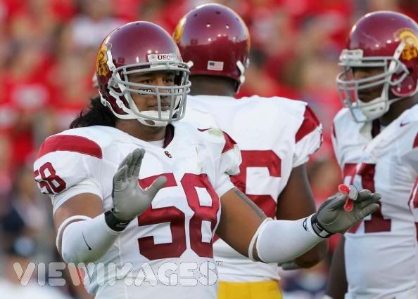 Star tailback Yvenson Bernard has been out most of the season for Oregon State with a broken wrist, and will miss at least two more weeks. His backup however, Clinton Polk, is approaching 1000 yards rushing and is a big factor in Oregon State's 6-2 record. It will be tough going for the Beavers' running game this week though, as they face the nation's 5th-ranked rushing defense in top-ranked USC, led by bone breaking middle linebacker Rey Maualuga. Maualuga is only one star on USC's defense though. If the Beavers key on him, there's always Keith Rivers, Brian Cushing, Taylor Mays, Lawrence Jackson, Sedrick Ellis, and others to clean up plays. The Trojans are one of three unbeaten Pac-10 teams. The others are UCLA (6th), and Arizona State (17th).