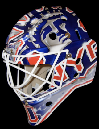 Devils Legendary Goaltender Martin Brodeur takes a new look into his possible record breaking season. Instead of the Devils logo in the front of the mask, he has a larger B, for Brodeur, in Devils form.