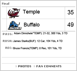 Buffalo, NY (AP) -- Buffalo did much better this week than they did against Pittsburgh. Ed Young came out and just had a huge day along with James Starks. However Temple did open the game up with a 14-0 lead, but from there Buffalo just worked around it and ended up winning the game 49-35. We got comments from player from Buffalo.