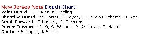 2. Depth: Keyon Dooling, Jarvis Hayes, Eduardo Najera, Brook Lopez, Ryan Anderson or whoever gives the Nets a pretty solid bench if they stay healthy. Figure the Nets will start the season going 10. Some serviceable if not talented players — Sean Williams, Stromile Swift (if healthy), Trenton Hassell — may get spot duty or just be used as specialists until a trade occurs.