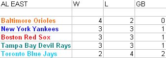AMERICAN LEAGUE EAST STANDINGS (AS OF APRIL 10TH)