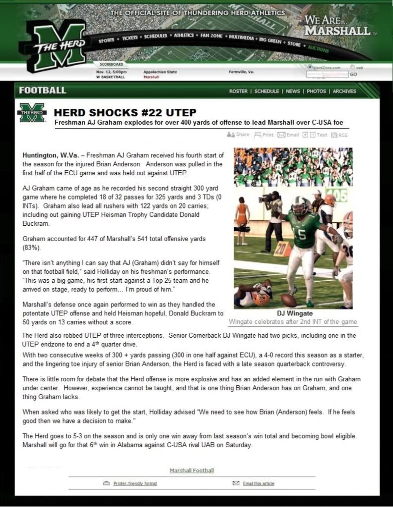 MU 4th Quarter Come-back: Graham to Dobson, 52 Yard gain with 30 Seconds remaining of game (down 24-27)