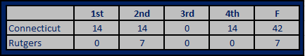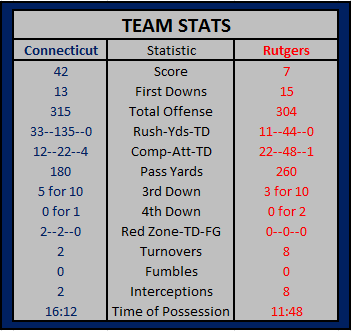 Connecticut improves their storybook season to a 6-0 record. Rutgers falls to 2-3 on the season. Connecticut will head back home to prepare for a visit from the Temple Owls. It will be the first time the two teams have met when both have been a part of the Big East Conference.