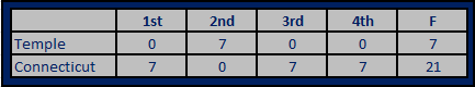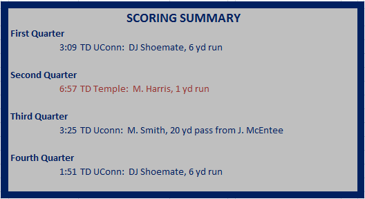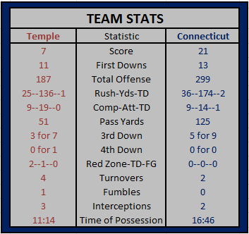 Redshirt senior running back DJ Shoemate found the end zone twice in the game. However, the score wasn't as lopsided as it looks. The game was actually quite close. What killed Temple was untimely turnovers. It seemed like Temple would be able to drive the ball well on UConn, only to throw an interception or have a fumble in or near the red zone.