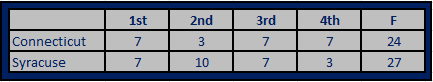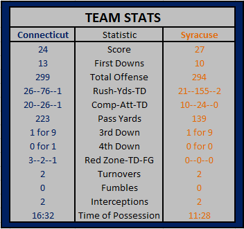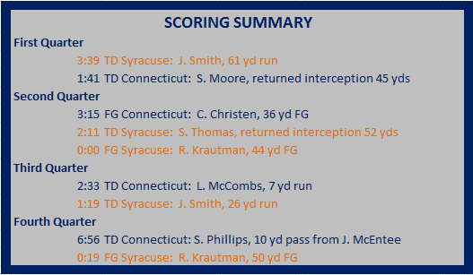 The Huskies and the Orange went neck and neck the entire game, with no one seemingly able to grab a distinct advantage. In the end, it was the Orange who came out on top, on the leg of kicker Ross Krautman. Krautman lined up a 50-yard field goal in the waning seconds of the 4th, and was able to split the uprights. Connecticut didn't give up though, as they were able to drive down the field to try a 44-yard field goal to tie the game. However, Connecticut kicker Chad Christen didn't have enough leg in it, as it fell just short of the crossbar, sealing the Huskies' first loss of the season.
