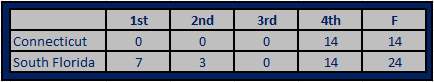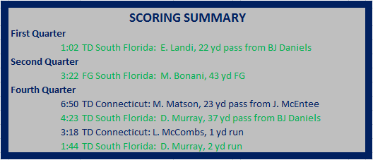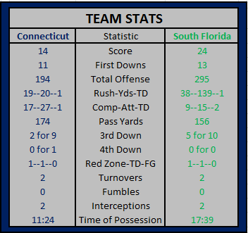 The Huskies were able to make a game out of it in the 4th quarter, and multiple times pulled within 3 points of a tie. But in the end, South Florida's running game was too much to handle. Both South Florida's running back and quarterback were threats on the ground, each picking up over 80 yards each. The Huskies just had no idea what play was going to be run, let alone how to stop it.