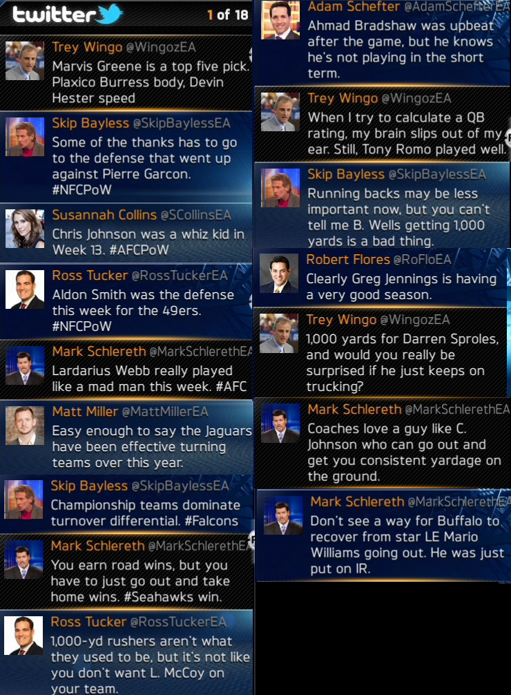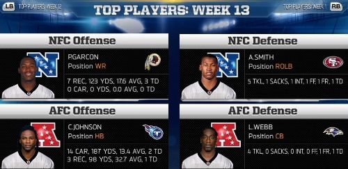 NFL Scores - Week #13 Thursday's Games Bills 38 - Buccaneers 17 Sunday's Games Falcons 38 - Giants 21 Chiefs 20 - Cowboys 34 Browns 27 - Texans 17 Broncos 30 - Redskins 28 49ers 28 - Rams 31 Panthers 14 - Saints 21 Packers 27 - Bears 14 Eagles 26 - Seahawks 34 Raiders 30 - Titans 38 Vikings 20 - Lions 41 Colts 21 - Chargers 28 Jets 27 - Dolphins 20 Steelers 31 - Bengals 38 Monday's Games Cardinals 17 - Jaguars 38 BYE WEEKS: None Last edited by JaymeeAwesome; 06-13-2013, 06:26 PM.Comment