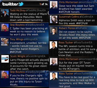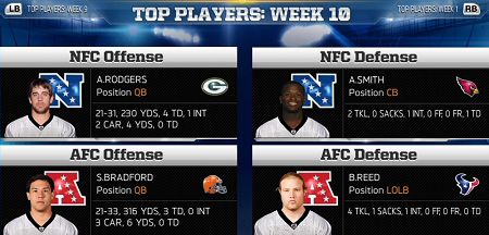 NFL Scores - Week #10 Thursday's Games Browns 41 - Titans 27 Sunday's Games Buccaneers 20 - Bears 27 Cowboys 27 - Eagles 10 Cardinals 25 - Raiders 32 Colts 31 - Texans 30 Jaguars 23 - Redskins 26 Steelers 38 - Bengals 16 Ravens 14 - Dolphins 28 Falcons 20 - Saints 17 Lions 17 - Jets 20 Chargers 34 - Broncos 39 Rams 17 - Chiefs 35 Monday's Games Packers 45 - Bills 21 BYE WEEKS: San Francisco | Carolina | New York Giants | Minnesota Comment