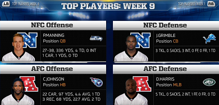 NFL Scores - Week #9 Thursday's Games Giants 29 - Cardinals 37 Sunday's Games Texans 23 - Titans 37 Bills 20 - Lions 23 Raiders 20 - Seahawks 45 Packers 32 - Bears 10 Jaguars 36 - Browns 30 Rams 20 - Chargers 6 Buccaneers 14 - Falcons 24 Steelers 26 - Ravens 24 Saints 20 - Vikings 41 Chiefs 21 - 49ers 29 Monday's Games Bengals 38 - Panthers 21 BYE WEEKS: Dallas | Philadelphia | Denver | Indianapolis | Washington | Miami Comment