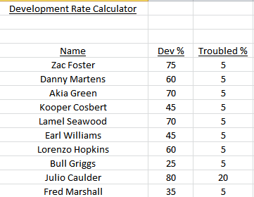 But perhaps there's some kind of quickish way I could randomize how I develop that might emulate players developing at varying rates and create the possibility of a top guy not panning out, etc.