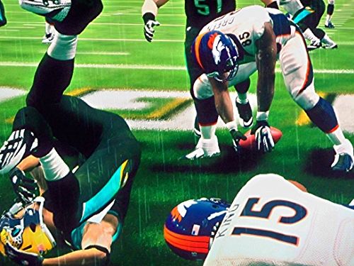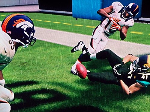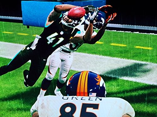 Piper took his first snap at the Denver 10 due to a holding call on the opening kickoff, and the Broncos went three and out, but the Jaguars were unable to capitalize on the good field position thanks to Martez Wilson taking down Stevan Ridley for a loss of 3 on 3rd and 1. After a second Denver three and out the Jags began their next series at the Denver 35, but they were quickly in a 3rd and 17 after Wilson got to Ridley for a loss of 4 and a scrambling Russell Wilson was sacked by Corey Wootton. A screen to Ridley converted and Russellmania’s 17 yard completion to Rakayle Shaafat put Jacksonville in a first and goal at the 5, but Denver’s goal line defense stepped up. After TFL’s of Ridley of 1 and 3 yards by Wootton and Taylor Mays, Shaafat dropped a pass in the end zone, and the Jags had to settle for drawing first blood with a field goal. The Broncos ended their next possession with a punt that was fair caught at the 11, and the Jaguars were in a 3rd and 7 at the Denver 22 when Aqib Talib made a sideline interception at the 7. In that drive, Ridley suffered a broken collarbone and was replaced by Bryce Brown. Lex Hilliard was stopped for no gain on the next play but then Virgil Green turned in a 47 yard catch and run. After a James Harrison sack put the Broncos in a 3rd and 11 and a bat by Deandre Levy forced a Dustin Colquitt punt that went out of bounds at the 12, the Jags went three and out after a measurement confirmed a ruling of 4th and inches. The punt gave the Broncos the ball at midfield, and three plays after the two minute warning they were in a 3rd and goal at the 3 when Antoine Bethea could have had an end zone interception of a pass intended for wild card hero Tavarres King. Instead, it was only a deflection, and instead of hitting the ground, it bounced off the knee of a falling Bethea, sending it in the direction of Green, who made a grasshopper-level catch for the touchdown that made the halftime score 7-3.
