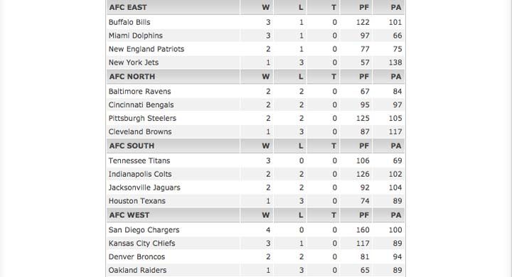 The Bills (3-2) will head home to take on Cincinnati (2-3) next Sunday, while the Titans (4-0) will host first place Miami next week. The game of the week will be Green Bay (5-0) and San Diego (5-0) in a battle of unbeatens at Lambeau Field.