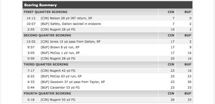 Passing: Dalton (CIN) 21-41 195 yds, TD, 2 INT; Taylor (BUF) 10-25 160 yds, TD, 3 INT