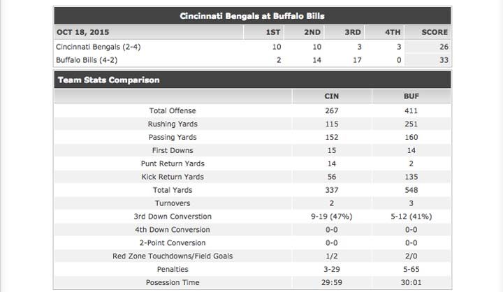 Rushing: McCoy (BUF) 28 car 188 yds, 2 TD; Hill (CIN) 25 car 106 yds