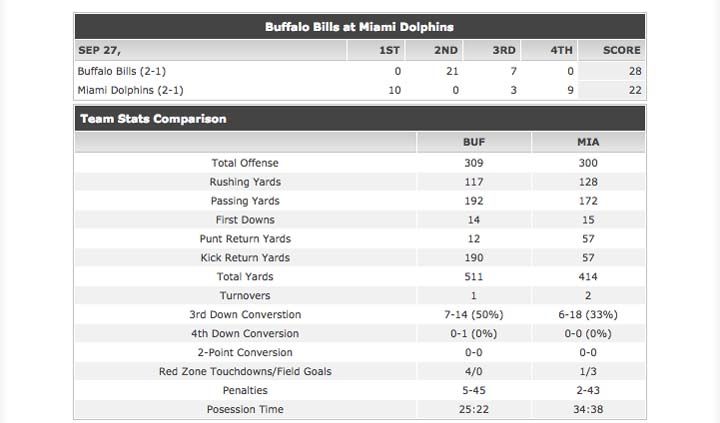 The Dolphins moved the ball effectively in the fourth, but the Bills defense stiffened when necessary, holding the Dolphins to three field goals. The Bills offense was able to run out the final 1:56 behind the legs of Shady McCoy to earn their second win on the year.