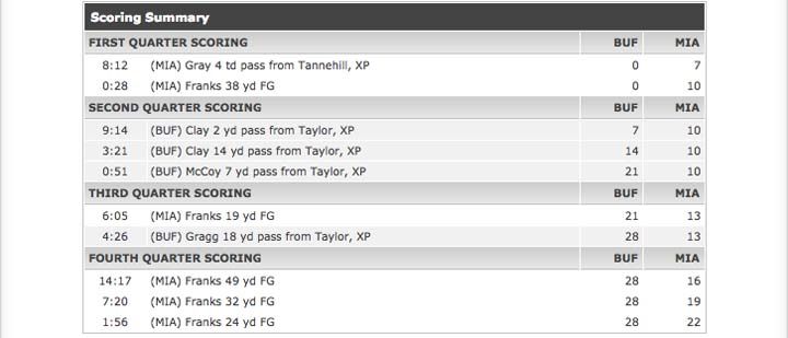 Passing: Taylor (BUF): 17-27 235 yds, 4 TD, INT; Tannehill (MIA) 21-33 233 yds, TD, INT