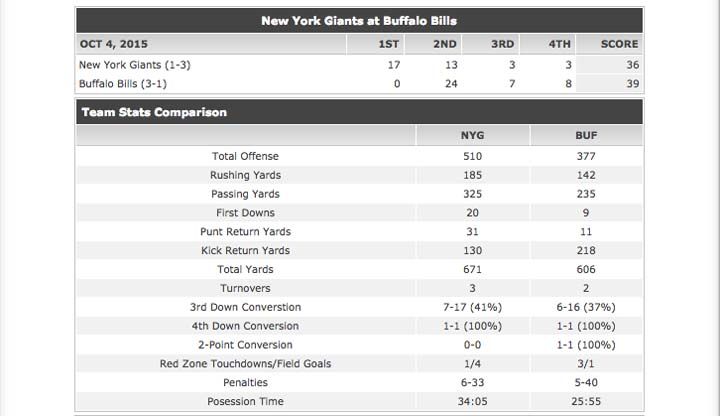 The Giants would get a last chance to tie it up and drove to the Bills 35 yard line late, but an Eli Manning pass to Odell Beckham in the dying seconds ended the game as he was tackled at the 17 trying to get out of bounds, while the clock expired.