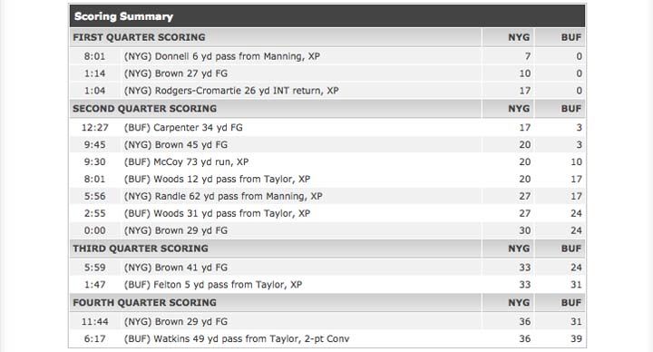 Passing: Taylor (BUF) 18-37 260 yds, 4 TD, INT; Manning (NYG) 16-33 260 yds, 2 TD, 2 INT