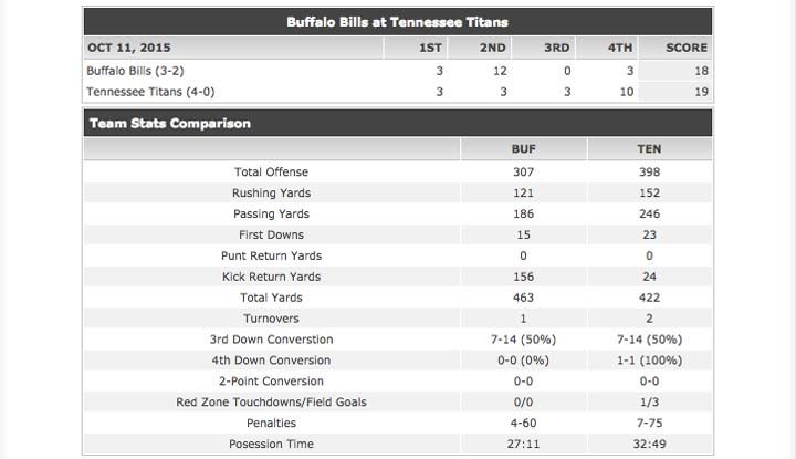 Passing: Mariota (TEN) 19-33 275, 2 INT; Taylor (BUF) 13-25 202, INT