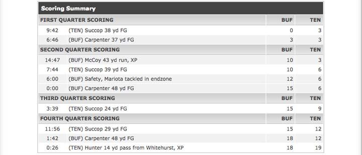 Rushing: Sankey (TEN) 28 car 133 yds; McCoy (BUF) 27 car 108 yds, TD