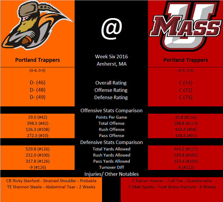 Amherst, MA - Pride is on the line as these two cellar dwellers get set to do battle this week. Both teams are winless on the season, and desperately need a win here to even have a chance at qualifying for a bowl game. The teams have one common opponent this season in Penn State. Portland suffered a 70-12 shellacking at the hands of the Nittany Lions in week one, and UMass fell 34-27 to them in week four.