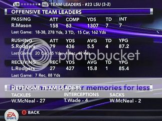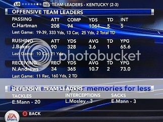 One frustration I had with the end of game sequence was the CPU's refusal to use its timeouts to preserve time while I had the ball. I have seen them do it before - I want to say it was versus Ohio St. in last year's season opener with Tulane, but I believe that was a situation where the game was tied. That's really the only reason I ran the ball a couple more times there at the end when I really didn't need to; I was just trying to be a little fair. However it finally got to the point where I was like "oh well, that's on them!" LOL
