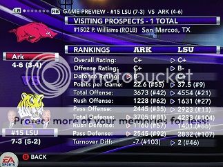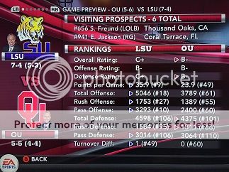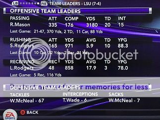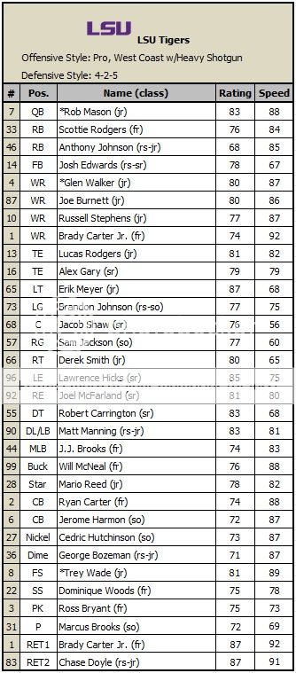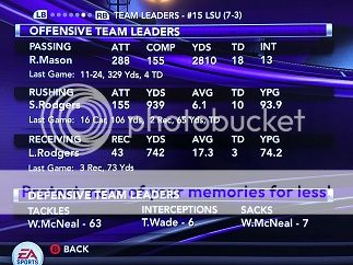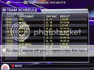 [SIZE=1] Opponent (record) Result LSU Player of the Game -Record- -------------------------------------------------------------------------------------------- vs Florida St. (4-8) L 24-28 QB Mason 15-30 232 yds, 11 car 45 yds 0-1 (0-0) at Texas Tech (3-9) W 72-42 QB Mason 13-16 308 yds, 5 total tds 1-1 (0-0) at #12 Tulane (8-3) L 21-49 FS Wade 4 tk 2 tfl 1 int 1 td 1-2 (0-1) vs #16 South Carolina (10-2) W 19-14 QB Mason 274 total yds, 2 rush tds 2-2 (1-1) vs #17 Florida (9-3) W 29-28 QB Mason 452 total yds, 3 pass tds 3-2 (2-1) at Kentucky (3-9) W 51-50 QB Mason 388 total yds, 5 total tds 4-2 (3-1) vs Auburn (3-8) W 49-14 WR Walker 4 rec 119 yds 2 tds 5-2 (4-1) vs Southern Miss (6-6) W 23-14 QB Mason 15-24 337 yds 2 total tds 6-2 (4-1) at #1 Alabama (11-0) L 35-43 RB Rodgers 13 car 173 yds 4 tds 6-3 (4-2) at Ole Miss (5-6) W 52-21 QB Mason 11-24 329 yds 4 tds 1 int 7-3 (5-2) vs Arkansas (5-6) L 20-30 QB Mason 458 total yds, 2 tds, 2 ints 7-4 (5-3) at Oklahoma (5-6) [/SIZE]