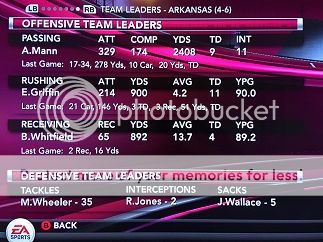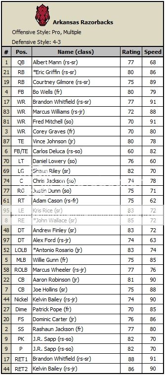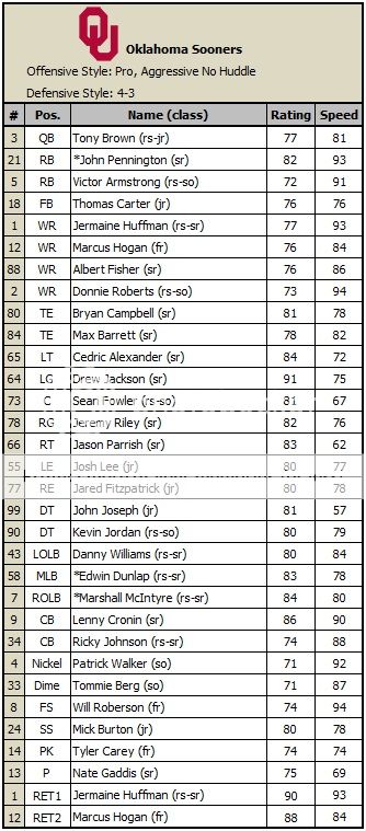 [size=1] [U] Passing RATING COMP ATT YDS TD INT [/U] 7-QB *Rob Mason(jr) 116.3 21 47 370 2 2 [U] Rushing ATT YDS TD [/U] 7-QB *Rob Mason(jr) 11 88 0 33-RB Scottie Rodgers(fr) 10 32 0 46-RB Anthony Johnson(rs-jr) 2 2 0 [U] Receiving REC YDS TD [/U] 13-TE Lucas Rodgers(jr) 5 116 0 10-WR Russell Stephens(jr) 5 79 1 4-WR Glen Walker(jr) 3 53 0 87-WR Joe Burnett(jr) 3 50 0 1-WR Brady Carter Jr.(fr) 3 47 0 (7 kr, 125 yds | 2 pr, 0 yds) 33-RB Scottie Rodgers(fr) 2 21 1 [U] Defensive Leaders TAK SOLO AST TFL SCK INT [/U] 8-FS *Trey Wade(jr) 10 8 2 3 0 0 44-MLB J.J. Brooks(fr) 6 6 0 2 0 0 (1 ff) 99-OLB Will McNeal(fr) 5 4 1 1 0 0 6-CB Jerome Harmon(so) 4 4 0 0 1 0 90-DE Matt Manning(jr) 4 4 0 1 1 0 28-SS Mario Reed(jr) 3 2 1 1 1 0 (1 fr) [u] Kicking FG MADE FG ATT LONG MISSED XP MADE XP ATT [/U] 3-PK Ross Bryant(fr) 2 2 40 n/a 2 2 [B][U]Key Team Stats:[/U][/B] Total Offensive Yards: 492 Rushing Totals: 23 att 122 yds 0 tds Sacks Allowed: 1 3rd down conversions: 7-14 (50%) 4th down conversions: 0-2 (0%) Offensive Turnovers: 2 Penalties: 4 for 34 yards Time of Possession: 16:37 [/size]