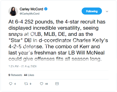 Incoming freshman LB Derek Kerr (75 ovr.) and freshman S Jon Walker (74 ovr.) are expected to compete for the STAR position role, per Bisciotti.