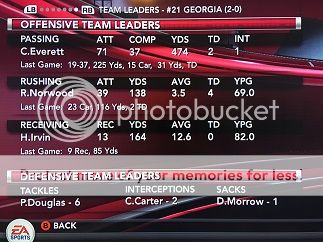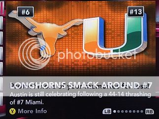Fifth year senior QB Sidney Keller (90 ovr) goes 21 of 29 for 267 yards and 3 touchdowns as Longhorns keep their hopes of a repeat alive | Michigan RB Patrick Green (91 ovr) rushes for 214 yards and a touchdown while sophomore slot WR Darren Atkins (74 ovr) grabs 8 receptions for 97 yards and 3 scores as 11th ranked Wolverines pick up huge 33-24 win over #10 Oregon | #2 USC blanks Washington St. 56-0, sets the stage for a critical matchup next week in Reno versus #8 Nevada | Green Wave sophomore QB Ryan Tyler (90 ovr) passes for 388 yards 3 tds and senior RB Brian Anthony (86 ovr) gets 173 yards and a touchdown on the ground as #12 Tulane wallops Kentucky 28-10; Wave now turns attention to next week's colossal bout with their former head coach D. Geezy