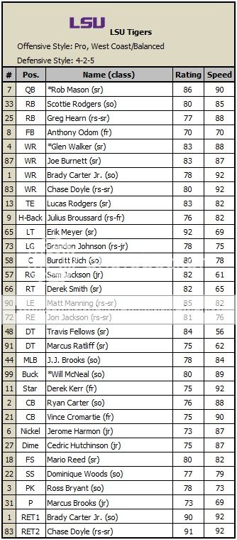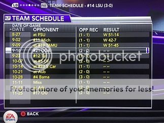 Code:[SIZE=1] Opponent (record) Result LSU Player of the Game -Record- ------------------------------------------------------------------------------------------------------- at Florida St. (2-1) W 51-14 QB Mason 340 total yds, 2 pass tds, 2 rush tds 1-0 (0-0) vs #9 Michigan (2-1) W 42-07 RB Rodgers 114 rush yds, 2 tds, 47 rec yds, 1 td 2-0 (0-0) at #18 Texas A&M (2-1) W 51-45 RB Rodgers 158 rush yds, 1 td, 63 rec yds, 3 tds 3-0 (0-0) vs #23 Georgia (2-1) W 19-17 PK Bryant 4 of 4 FGs, long of 38, 1 of 1 XPs 4-0 (1-0) vs #10 Tulane (2-1) at #5 Florida (3-0) at South Carolina (1-2) at Auburn (3-0) vs #4 Alabama (3-0) vs Ole Miss (2-1) at Arkansas (2-1) vs #14 Oklahoma (3-0) [/SIZE]