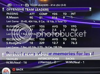 Code:[size=1] [U] Passing RATING COMP ATT YDS TD INT [/U] 7-QB *Rob Mason(sr) 130.4 20 35 290 1 1 [U] Rushing ATT YDS TD [/U] 33-RB Scottie Rodgers(so) 16 66 0 7-QB *Rob Mason(sr) 7 -7 0 28-RB D.J. Weaver(jr) 6 28 0 25-RB Greg Hearn(rs-sr) 2 14 0 [U] Receiving REC YDS TD [/U] 33-RB Scottie Rodgers(so) 5 46 1 25-RB Greg Hearn(rs-sr) 4 39 0 4-WR *Glen Walker(sr) 3 65 0 87-WR Joe Burnett(sr) 3 63 0 9-TE Julius Broussard(rs-fr) 2 27 0 1-WR Brady Carter Jr.(so) 2 26 0 (2 kr, 28 yds | 2 pr, 13 yds) 13-TE Lucas Rodgers(sr) 1 24 0 [U] Defensive Leaders TAK SOLO AST TFL SCK INT [/U] 99-OLB *Will McNeal(so) 8 7 1 1 0 0 18-FS Mario Reed(sr) 7 6 1 1 0 0 22-SS Dominique Woods(so) 7 5 2 1 1 0 11-OLB Derek Kerr(fr) 3 2 1 1 0 0 6-CB Jerome Harmon(jr) 2 2 0 1 0 1 (1 ff) 90-DE Matt Manning(sr) 2 2 0 1 0 0 (1 fr) [u] Kicking FG MADE FG ATT LONG MISSED XP MADE XP ATT [/U] 3-PK Ross Bryant(so) 4 4 38 n/a 1 1 [B][U]Key Team Stats:[/U][/B] Total Offensive Yards: 391 Rushing Totals: 31 att 101 yds 0 tds Sacks Allowed: 2 3rd down conversions: 4-13 (30%) 4th down conversions: 0-0 (0%) Offensive Turnovers: 1 Penalties: 4 for 40 yards Time of Possession: 20:08 [/size]