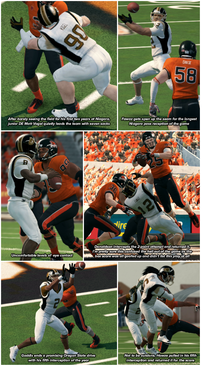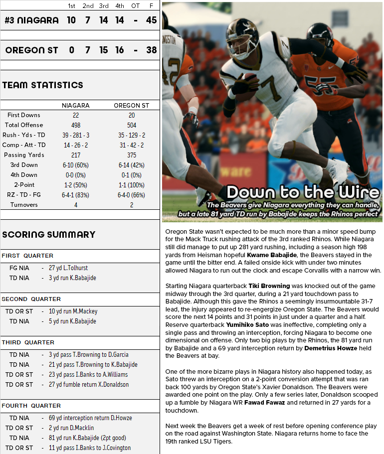Well, you can't blow teams out every week, so it's good to see that you can still find a way to win in the tight battles, especially even when missing your starting QB. Kwame has been an absolute man on a mission this year, and I'm sure you are enjoying have a running back who actually has the speed to breakway from the defense and break off some long runs, which seems to be extra hard to do in NCAA 14 unless you have a guy with 99 speed.