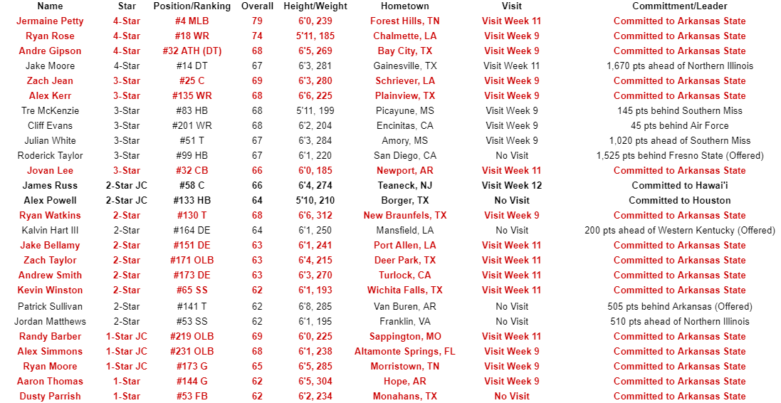 Since our last large recruiting update we have had a lot of commitments and have added a few people after losing some recruits. The first big recruit that has committed to Arkansas State is 4-star WR Ryan Rose (74) (recruiting profile below). With three seniors graduating, including top receiver Jonathan Adams Jr., Rose is a huge addition to this Arkansas State team. He has the size and speed to play the slot but don't underestimate his hands as he can definitely catch the ball.