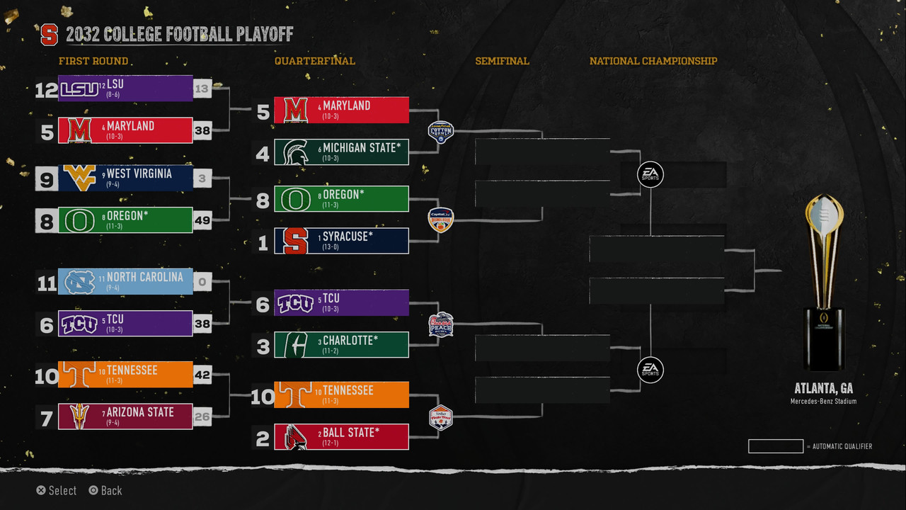 • No. 12 LSU at No. 4 Maryland – The Tigers head to College Park for a chance to meet Big Ten champion Michigan State in the Cotton Bowl.
