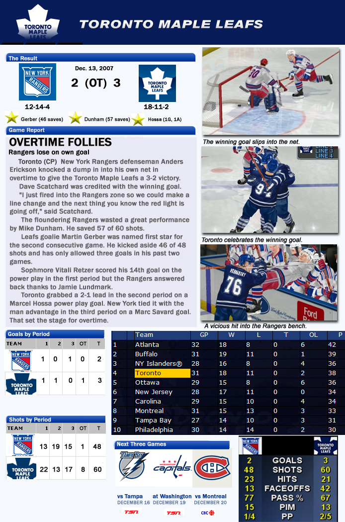 NY Rangers at Toronto, 2007, Game 31