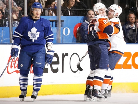 Things got off to a really disconcerting start for the Isles as the Leafs opened the scoring 7 minutes into the first period, short handed, off the stick of a non-goal scorer in Colton Orr of all people, his second goal of the season. Phil Kessel would net his first of two goals 10 minutes later on a beautiful shot from the right face off dot to put the Leafs up 2-0.